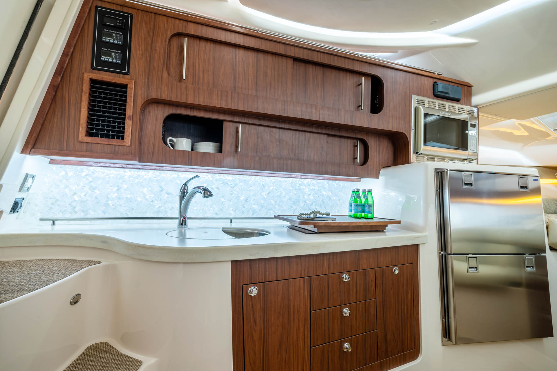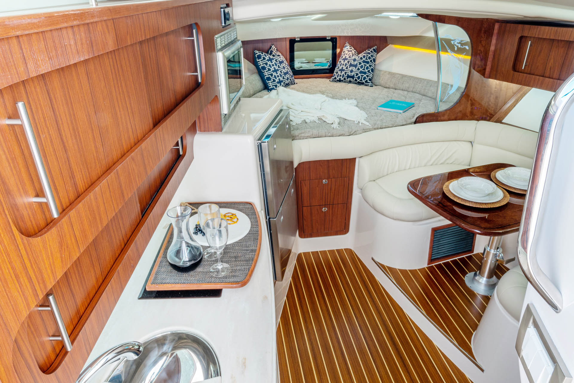 The Express 370 features an AV²® hardtop with electronically sliding sunroof, providing the perfect balance of sun and shade. The grand cabin includes a full galley with amenities such as a stainless steel refrigerator, microwave, and electric stove, making extended cruising comfortable and convenient.