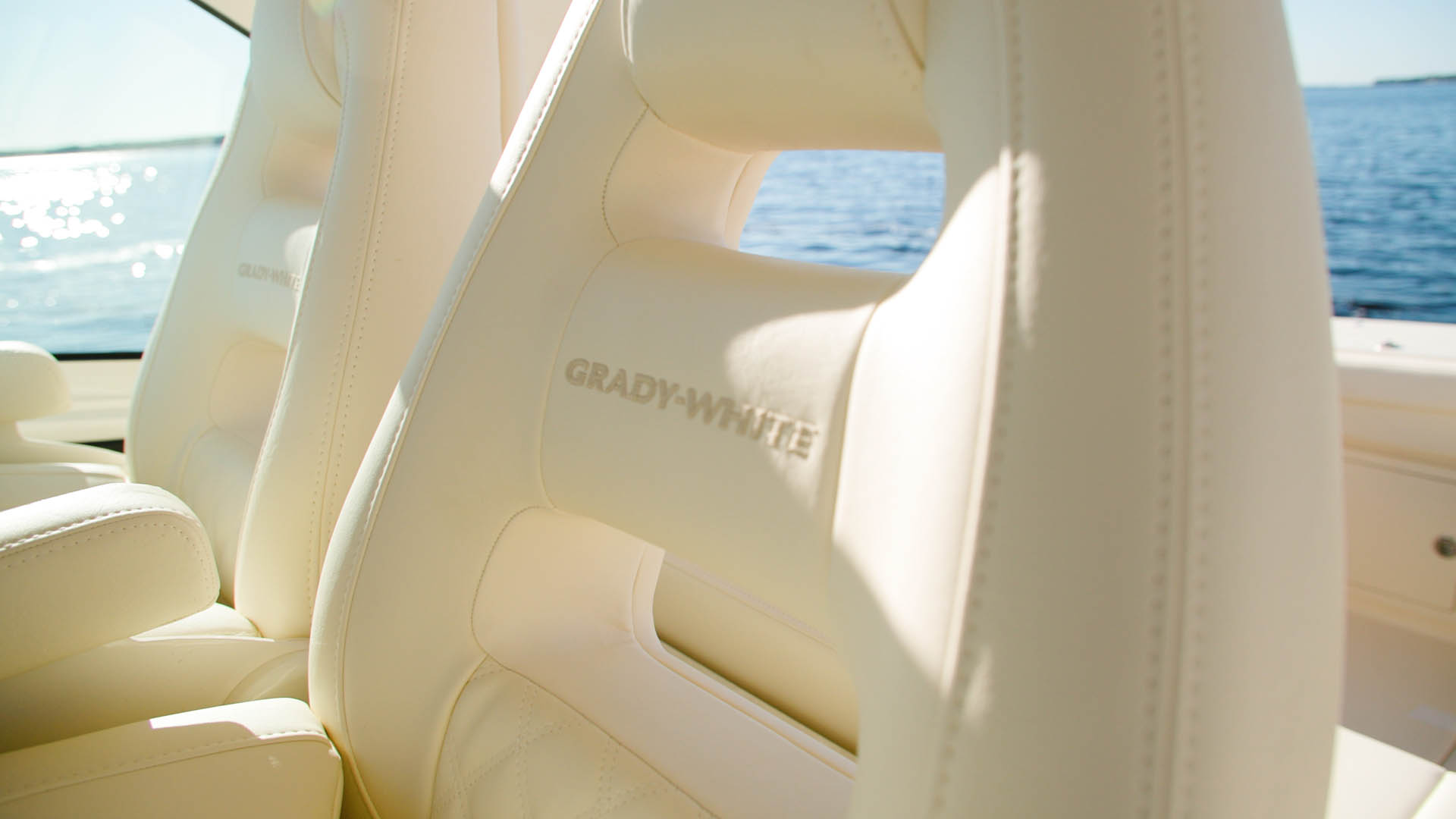 Experience the legendary Grady-White quality with features like the electronically adjustable companion seating, wet bar in the cockpit, and the comfortable console interior with sleeping accommodations.