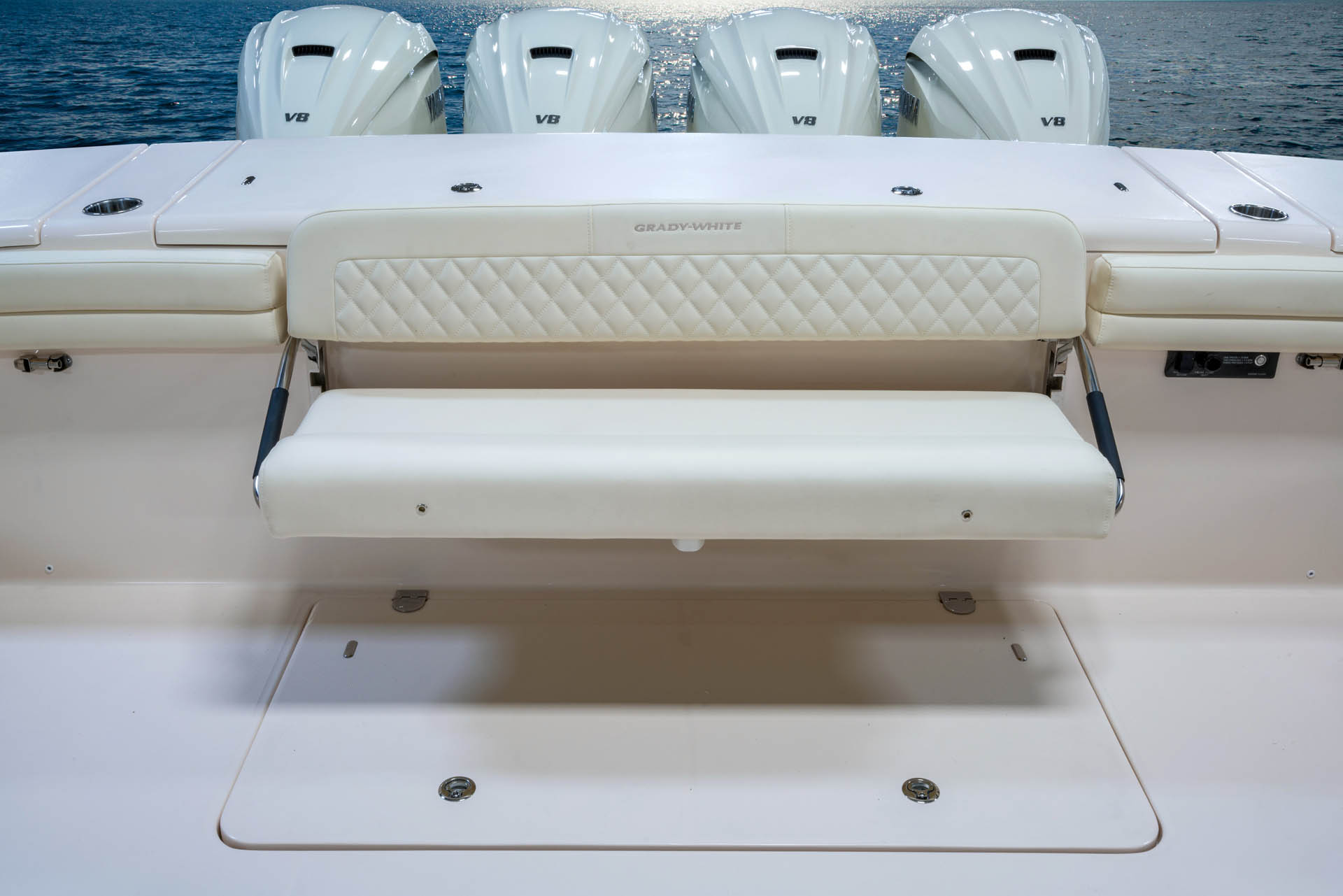 The Freedom 415 represents the pinnacle of dual console design. With its massive cockpit space, luxurious seating arrangements, and premium finishes including handcrafted custom cabinets with cane inlay, this boat sets new standards for comfort and style. Powered by quad Yamaha XTO Offshore® 450 engines delivering 1,800 total horsepower, the Freedom 415 provides exceptional performance with a top speed approaching 60 MPH while maintaining the legendary Grady-White SeaV²® hull stability.