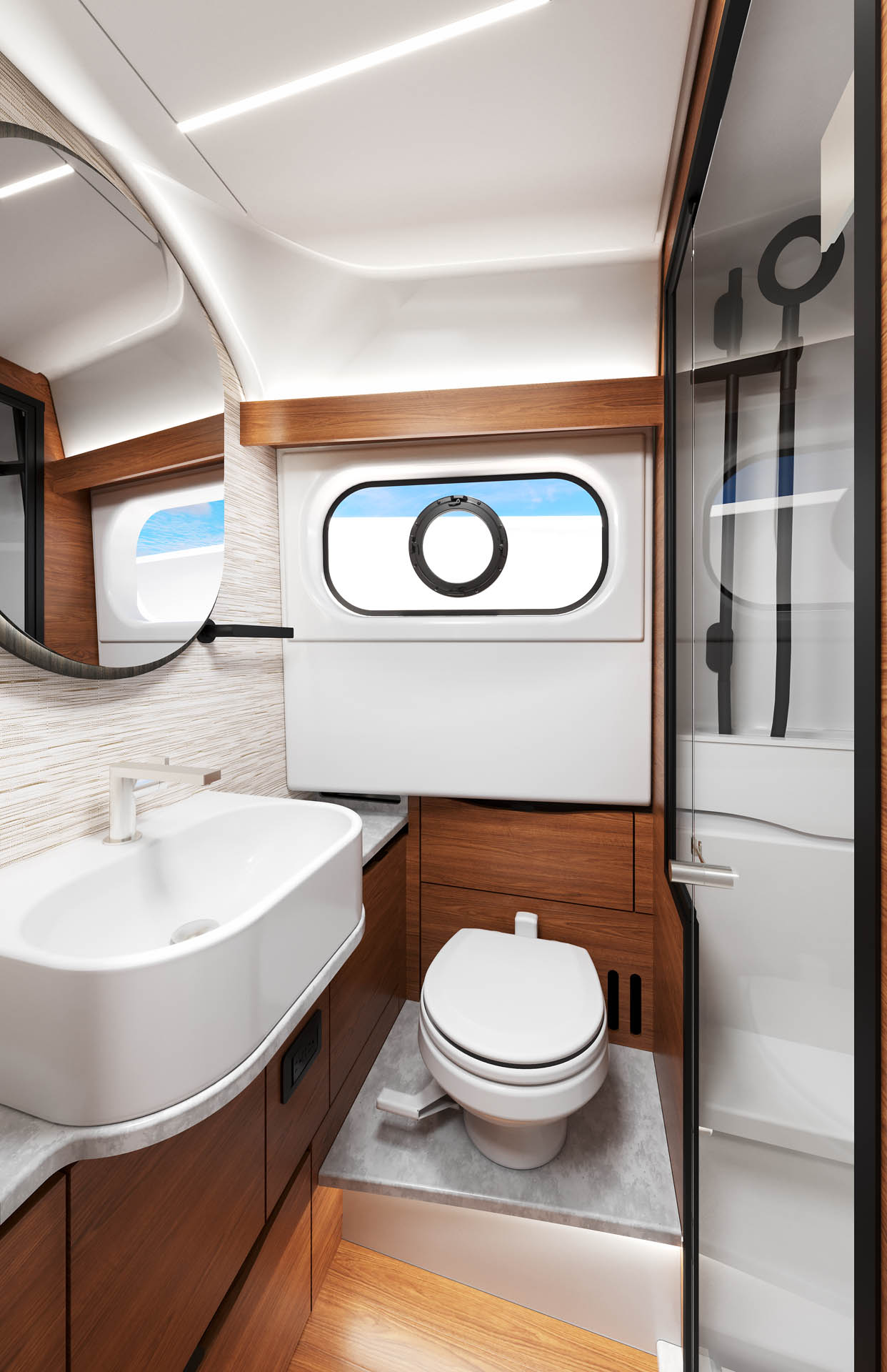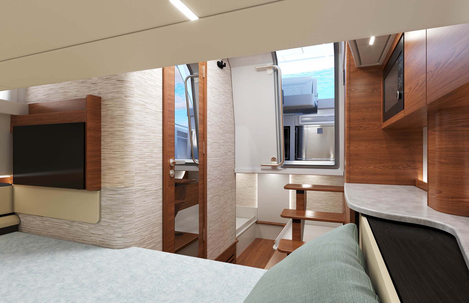 A portside terrace expands the cockpit and allows for further enjoyment of the water while a starboard side boarding door allows for passageway. Below deck a forward queen berth, private head and spacious mid cabin storage area with berth conversion can host guests overnight or provide a quiet respite.